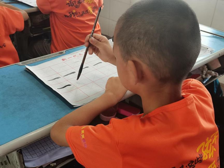 磨浓墨一砚,展宣纸一卷,嗅墨香一袭,寻传统一角。支教队队员姚志锐首先带领同学们复习了毛笔的握笔姿势及横、竖的写法,在复习巩固之后,同学们加深了对知识的理解,强化了对软笔书法的掌握。随后沿着上一次课程的学习脚步,姚志锐以两句口诀“右按逆起、左下滑行、由重到轻、力到锋端”“逆起、右下行、重按、轻出角”介绍了撇捺的写法。最后观看了相关笔画教学视频后,姚志锐让同学们自主练习,他逐个纠正同学们的握笔姿势和行笔力度,同学们受益匪浅。俯仰中华上下五千年,笔墨纸砚薪火相传,通过这节书法课,同学们领略了书法之美、汉字之神秘,了解了中国灿烂如星河的宝贵文化财富。